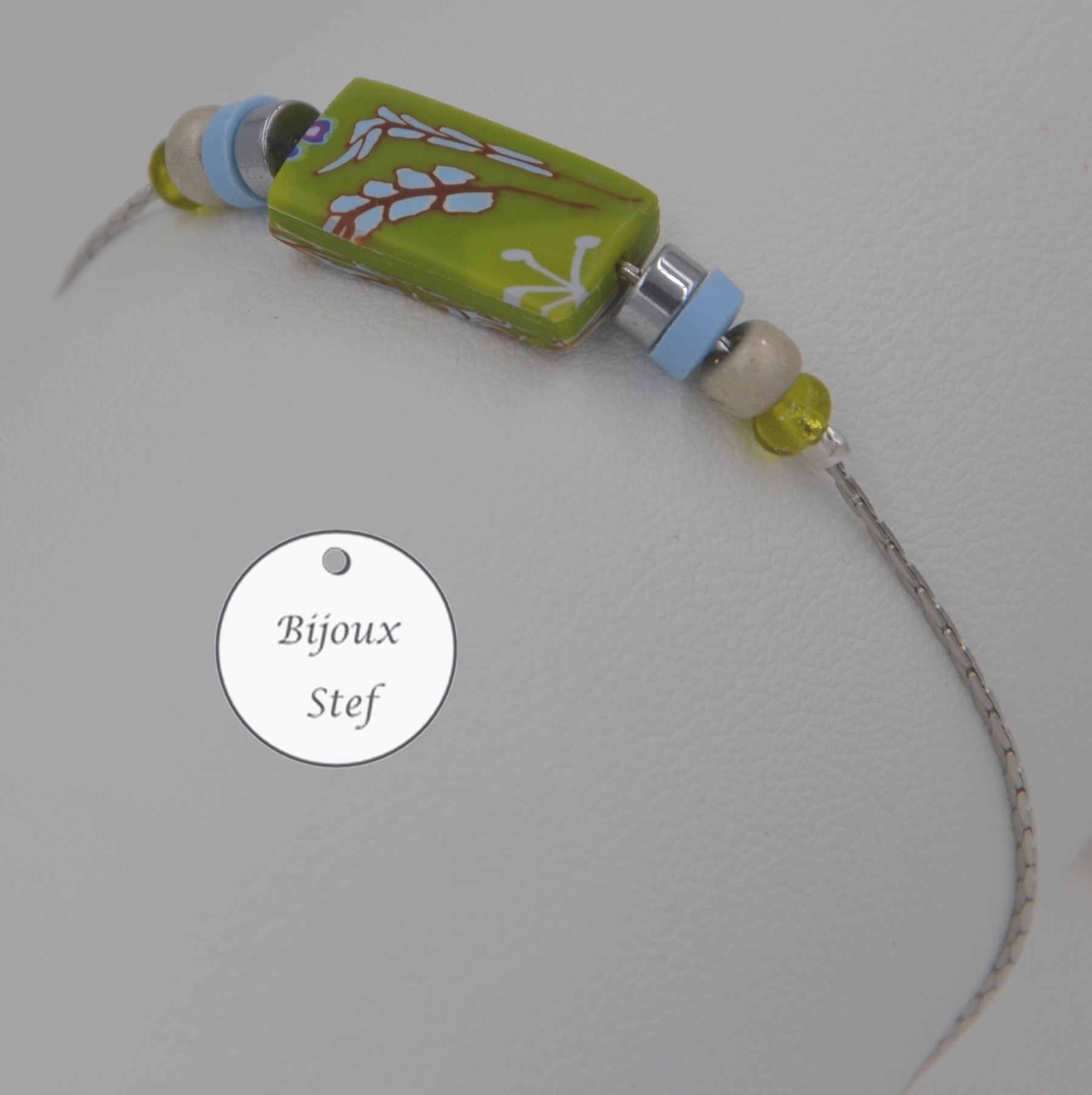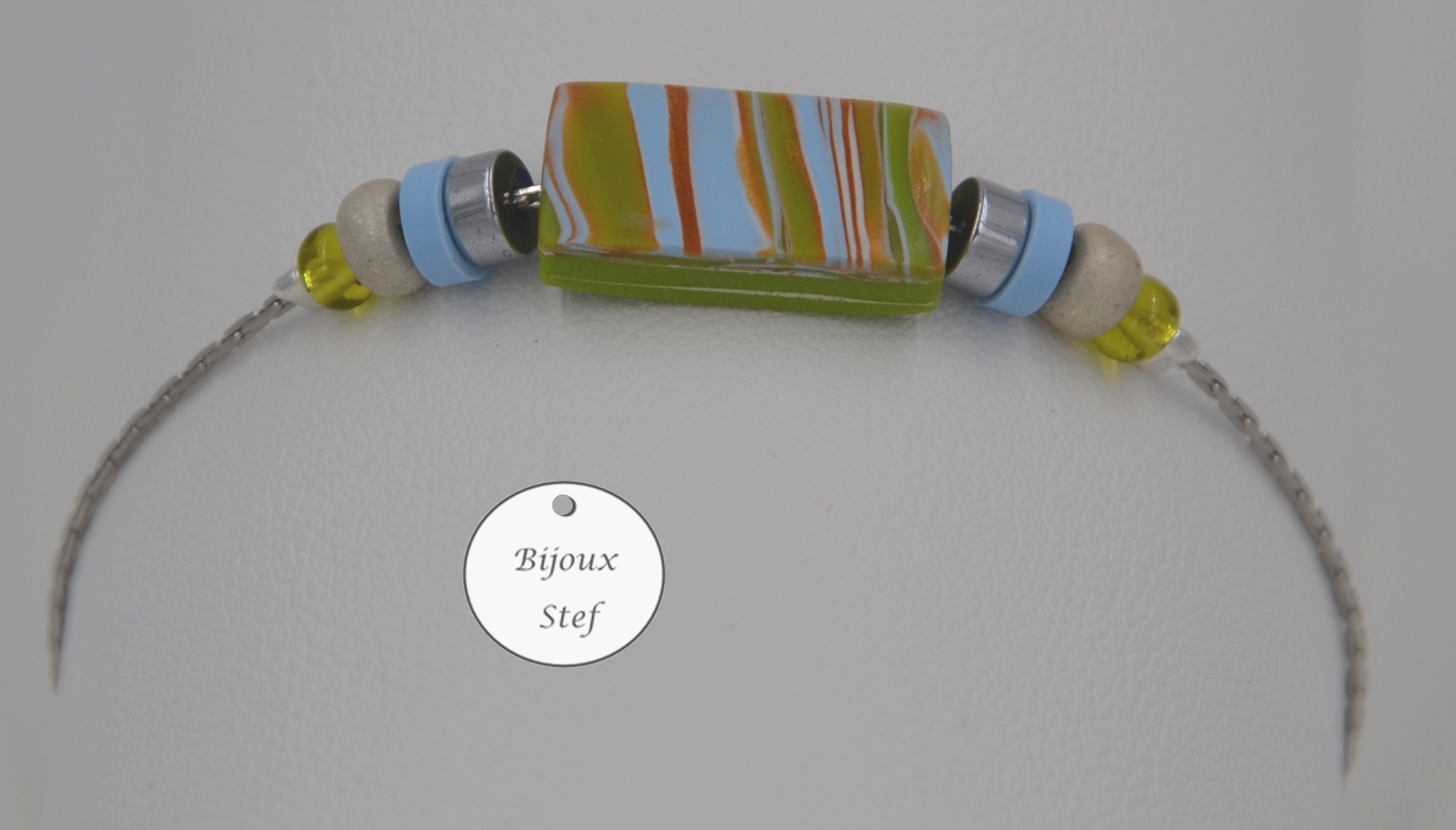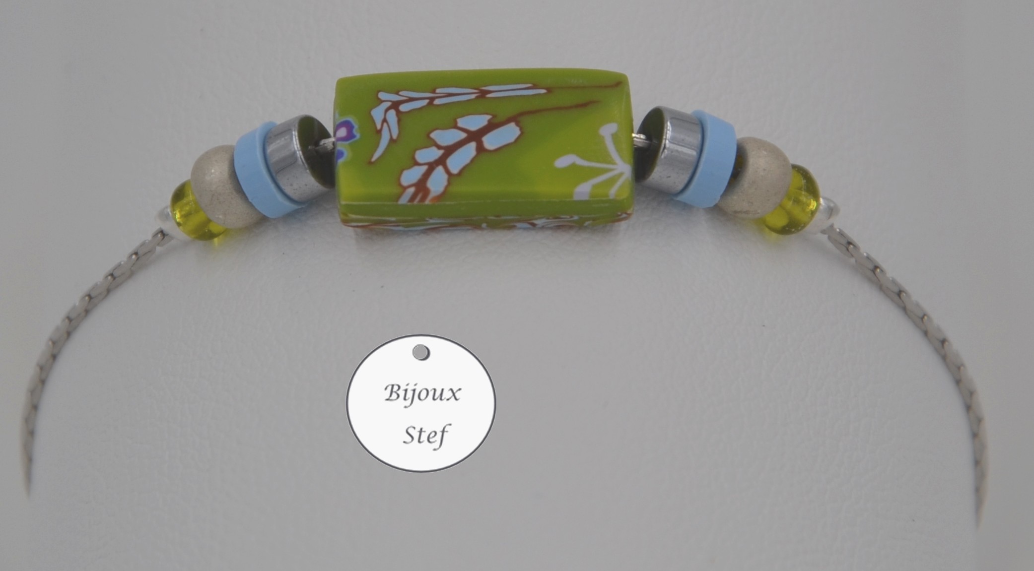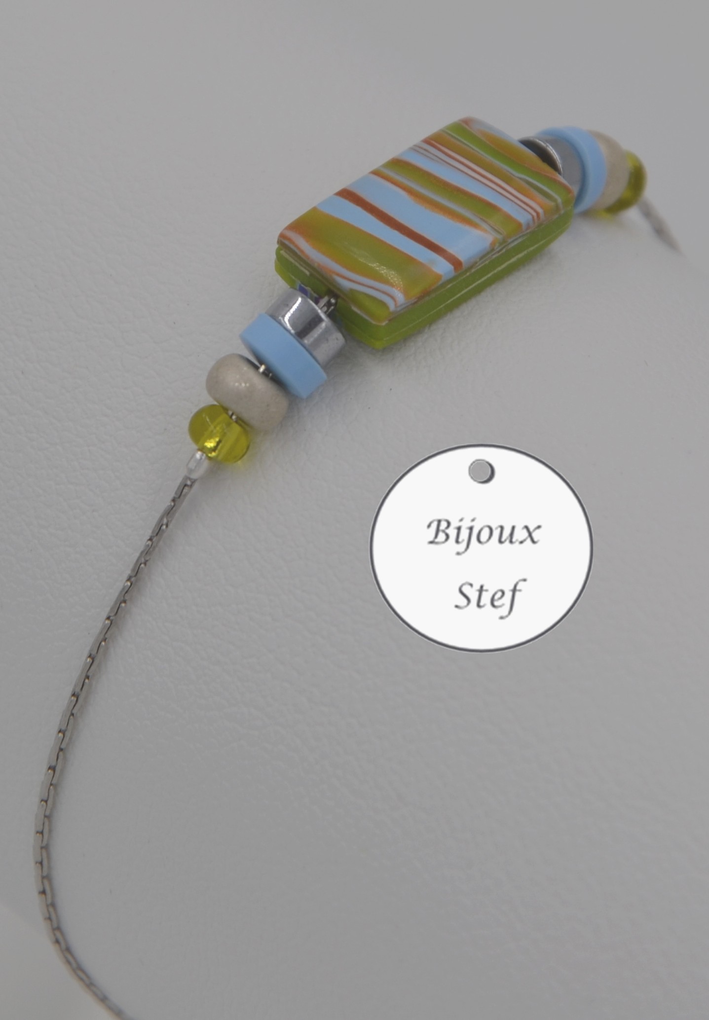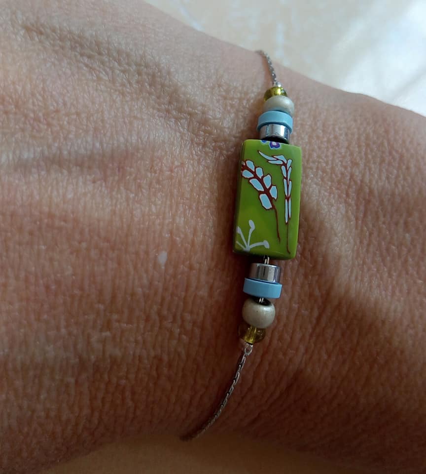 Argile polymère, chaine serpentine 0.8mm, perles de rocaille, perles hématites
